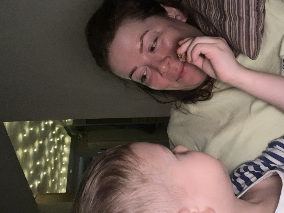 A woman with dark hair and a light-colored t-shirt lies down with her head propped on a striped pillow, holding something up to her mouth with her right hand. Her gaze is directed toward a baby lying beneath her, the baby's face close to the camera. Behind them, string lights are visible in the corner, adding a warm glow to the scene.