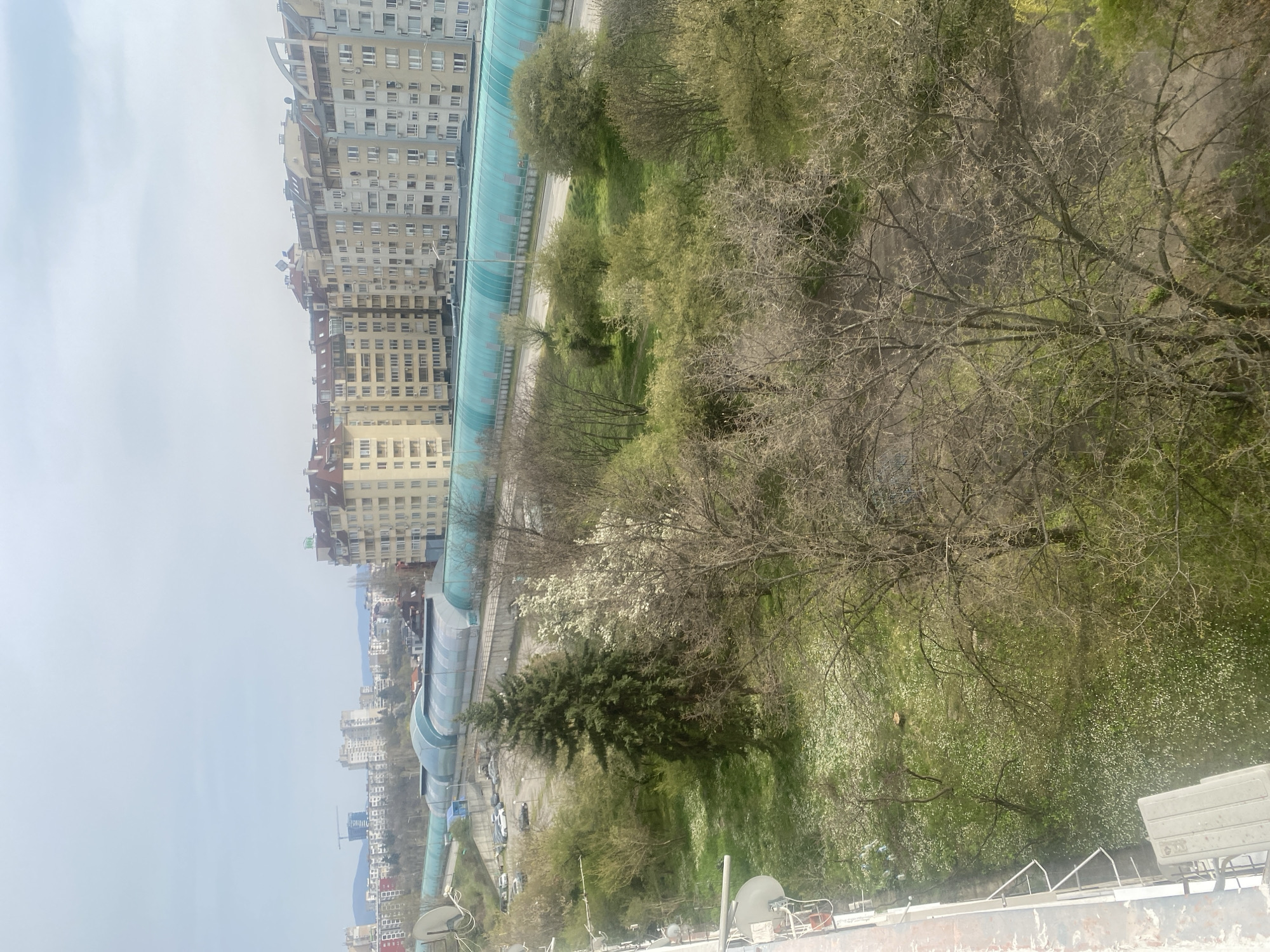 This is an eye-level, exterior shot of an urban landscape in Sofia, Bulgaria. The scene is taken from an elevated position, possibly a balcony or rooftop, overlooking buildings, a highway, and green spaces. In the foreground, a section of a rooftop with some satellite dishes and structural elements is visible. Beyond this, there is a view of a highway partially covered by a light blue architectural structure. A line of cars is parked along the highway. Adjacent to the highway is a green area, potentially a park or a roadside landscape. The green space includes trees with light green foliage and some trees that appear bare. Patches of white flowers are scattered on the green surface. In the background, there are several tall residential buildings of varying heights and colors. These buildings line the left side of the frame and create a dense urban backdrop. In the far distance, there are additional buildings and the suggestion of mountains. The sky is overcast.