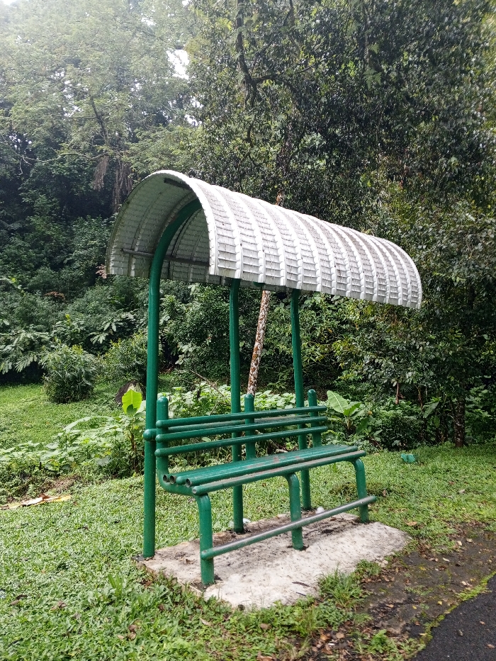 A green metal bench with a curved, corrugated metal roof stands on a concrete pad at the edge of a grassy area. The structure is surrounded by lush greenery and trees, creating a secluded and natural setting. The bench appears to be a place for rest or shelter along a path.