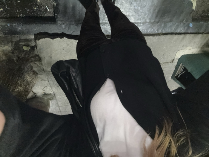 From an overhead angle, a person is seen in a black outfit, consisting of a partly unbuttoned shirt over a white tee, and velvet pants. A black leather jacket is draped over an arm. The backdrop includes concrete and a green, partially visible container, suggesting an urban environment. The overall lighting appears dim, creating shadows and enhancing the textures of the clothing and surfaces.