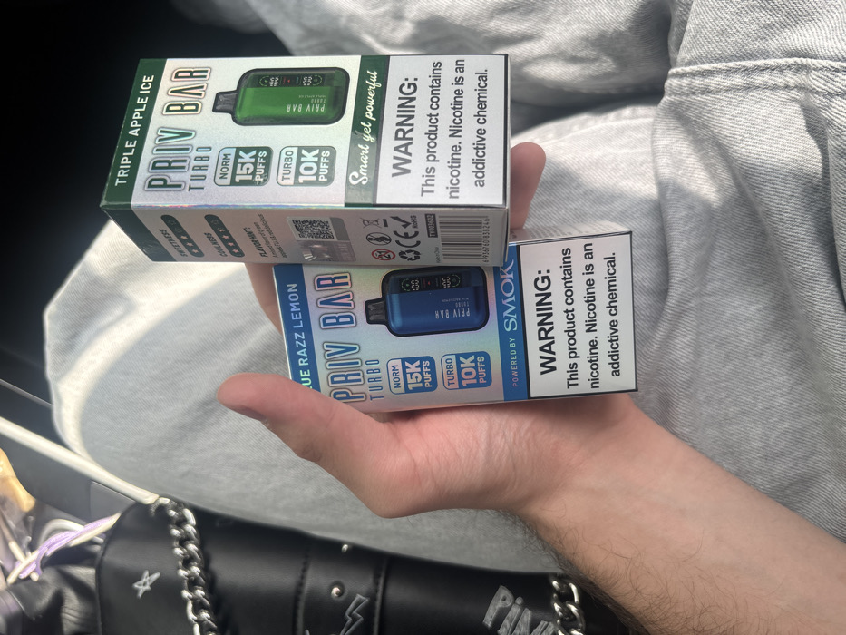A single human hand, with visible forearm hair, is centrally positioned, holding two "PRIV BAR TURBO" disposable vape boxes