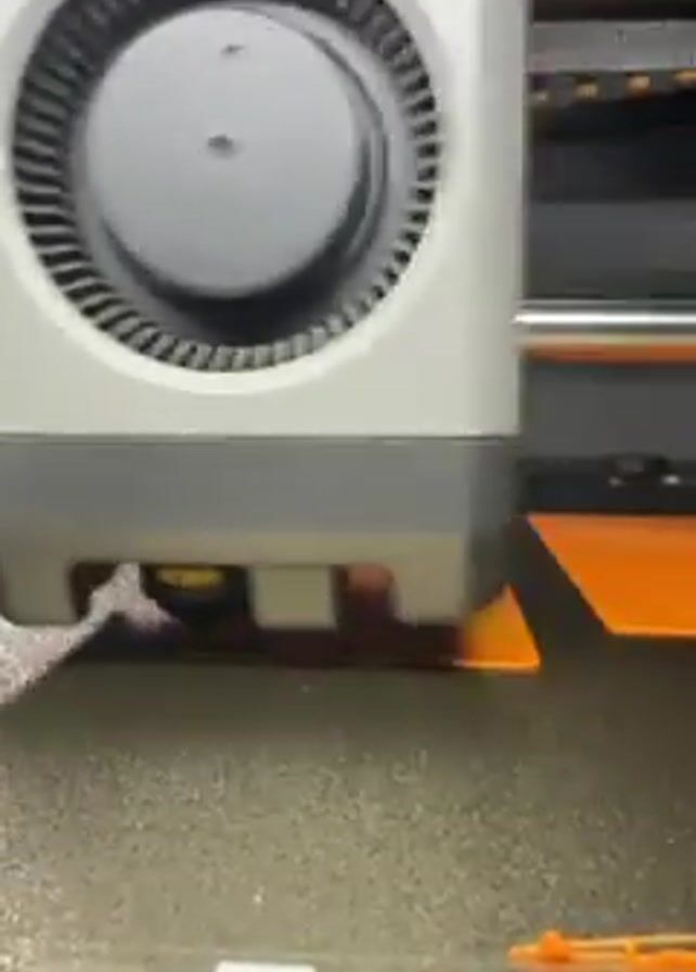 close-up of a 3D printer in action. The printer head, with its large circular fan, is visible as it moves across the printing bed. The printing bed is a textured surface, and a small, orange triangular object is being created. The printer head moves back and forth, laying down layers of material to form the object. Metal rods and other components of the printer's structure are visible in the background.