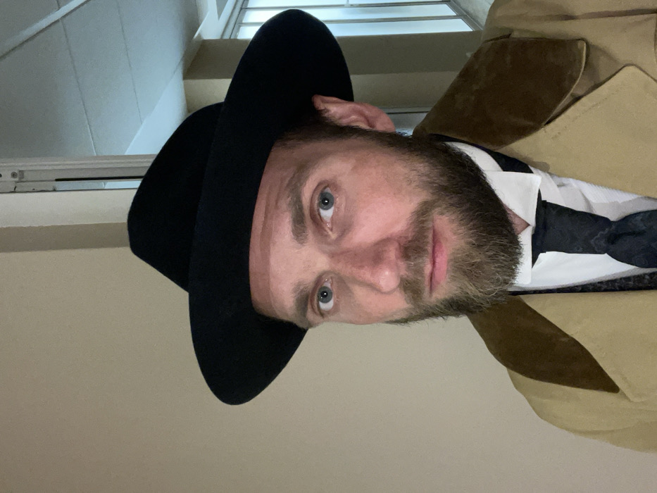 A man with a beard and blue eyes wears a black fedora and a tan trench coat