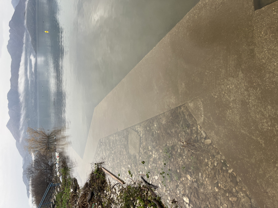 The scene depicts a shoreline area of a body of water in Vranjina, Montenegro, under an overcast sky. In the foreground, a pebbled bank on the left is partially submerged, showing clear water over the stones and sparse green vegetation. A wooden plank lies partially in the water near the bank. Further along the bank, blue metal handrails from a set of stairs are partially visible above the water level, with accumulated debris including plastic bottles and bags along the waterline. A small group of approximately five white waterfowl (ducks or geese) is visible swimming near this cluttered section of the shore. A bare deciduous tree with light-colored branches is partially submerged in the water. Extending from the left bank into the water is a submerged, light-colored concrete walkway or platform, presenting a distinct angular, zigzag pattern as its surface remains visible beneath a thin layer of murky water. The water immediately adjacent to the concrete structure on the right side appears deeper and more turbid, reflecting the overcast sky and distant mountains. In the mid-distance on the water, a yellow conical buoy is visible. The background features a range of dark mountains, their upper portions partially obscured by low-hanging clouds or mist. The overall water surface is calm with minor ripples. No human subjects are present.