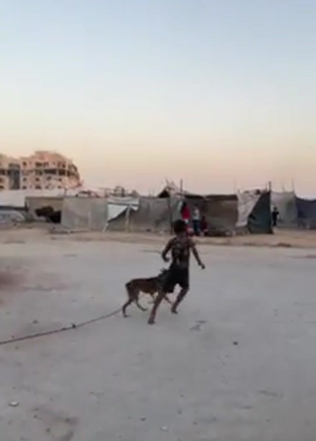 A young boy is running with a dog on a leash in an impoverished area. The dog appears to be pulling him. Several makeshift tents and buildings are in the background, alongside other people. The sky is light.