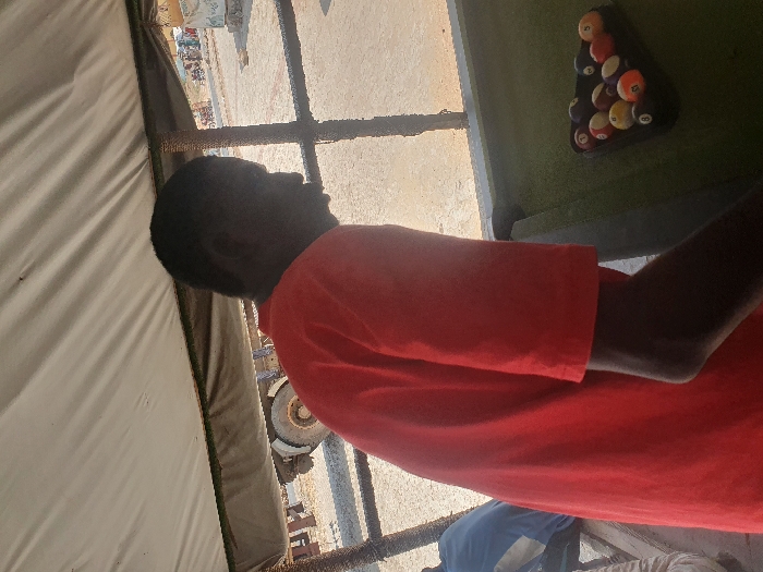 The image portrays an outdoor recreational scene in Lokoja, Nigeria, under a light-colored fabric canopy