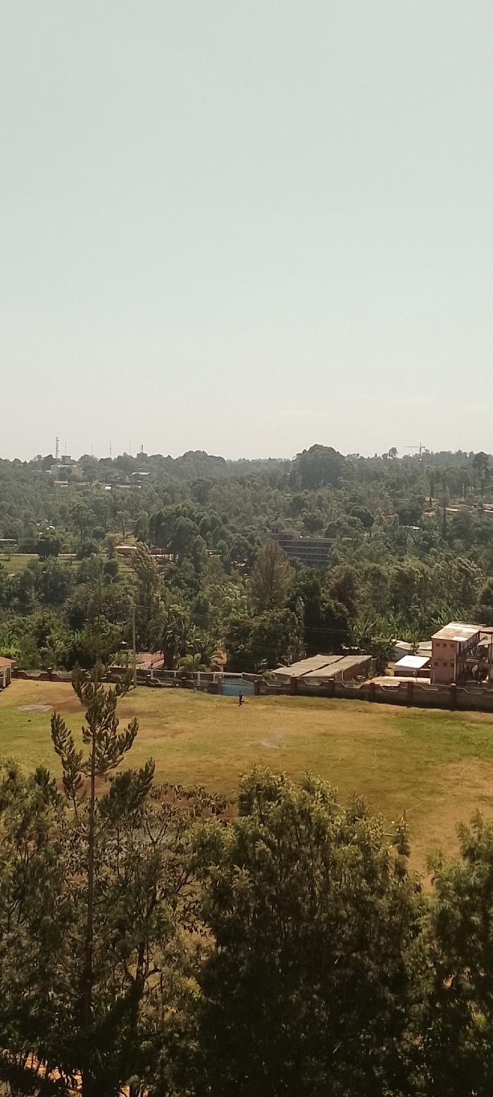 An elevated, wide-angle daytime photograph depicts a sprawling landscape within Karingani ward, Kenya, under a hazy, light grey-blue sky. In the foreground, dense green tree canopies partially obscure the bottom of the frame. Above these, a large, irregularly shaped field of predominantly dry, brownish-green grass spans the mid-ground. One individual, dressed in dark upper wear and light lower wear, is visible walking or jogging across the field towards the left. The field is bordered by a light-colored perimeter wall, behind which stands a cluster of buildings. These include a multi-story structure with reddish-brown walls and a flat roof to the right, adjacent to single-story utility-style buildings with light corrugated roofs. The extensive background is characterized by undulating terrain covered in dense, varied green foliage. Numerous man-made structures are integrated into this landscape, including several communication towers on distant hilltops in the left-mid background, various multi-story buildings partially hidden by trees, and a yellow construction crane visible above the tree line on the far right horizon.