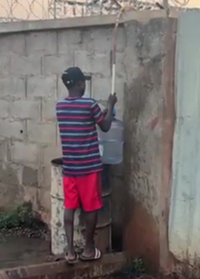A young male stands atop a rusted metal barrel, dressed in a blue-and-red striped shirt, red shorts, and a black baseball cap. He is positioned next to a weathered concrete block wall topped with barbed wire. He grips a long, white PVC pipe attached to a large, clear plastic water jug. The jug appears to be filling with water from the pipe. The environment consists of dirt and minimal vegetation, with hints of an industrial or potentially hazardous area. A white bucket sits on the ground nearby. The overall lighting suggests it is either early morning or late afternoon.