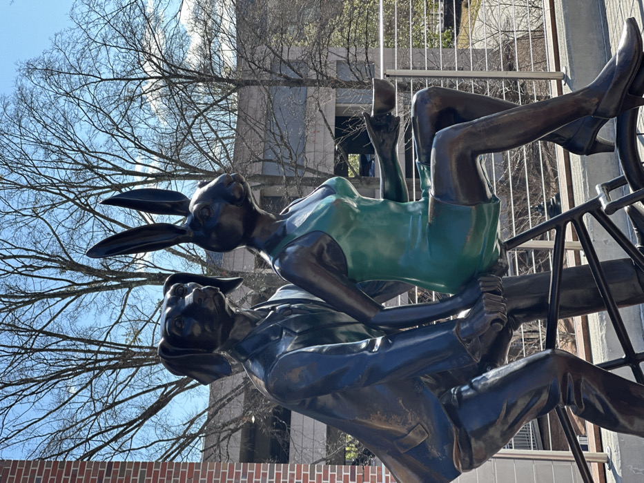 A bronze sculpture features two anthropomorphic rabbits in formal attire