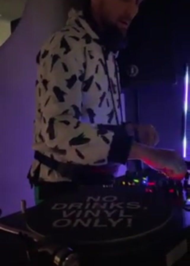 A DJ is mixing music on two turntables with a mixer in a dark club environment with blue lighting. The DJ is a man with short brown hair and a beard, wearing a white hoodie with black bird patterns and headphones around his neck. He is standing behind the DJ equipment, manipulating the controls on the mixer and the turntables. One of the turntables has a slipmat that reads "NO DRINKS, VINYL ONLY!". Behind him, there is a dark wall with a round speaker and a vertical strip of blue light. The DJ is focused on his mixing, looking down at the equipment and adjusting the levels.