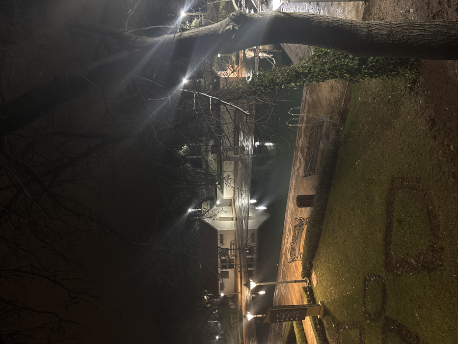 Night scene of a building next to a body of water, likely a pond or lake. The building is illuminated, and its reflection is visible in the water. A path runs along the water's edge with benches and light posts. A tree with bare branches and a thick trunk frames the top of the image. The scene is dark, and the illumination creates a stark contrast with the surrounding darkness. Some grass is visible in the lower right.