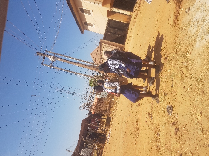 The image depicts an outdoor scene in what appears to be a semi-urban or peri-urban area within Jos, Nigeria, under a clear, bright blue sky. The foreground and midground consist of an unpaved, reddish-brown dirt surface with scattered dry vegetation and small debris. In the midground, a group of five young individuals, identified as females based on their attire, are present. They are uniformly dressed in plaid long-sleeved shirts (white and blue checks) and navy blue skirts, consistent with school uniforms. Most individuals are carrying light-colored backpacks. Their footwear includes sandals and dark closed-toe shoes. They appear to be walking together as a group, generally moving from left to right across the frame. The environment features multiple overhead power lines crisscrossing the sky. On the right side of the frame, a wooden or concrete utility pole equipped with a transformer is visible, supporting numerous electrical cables. To the far left in the background, a large metal lattice-structure electricity transmission tower stands against the sky. Further left in the midground, an open-air stall or shelter with a corrugated metal roof and wooden supports is visible, with faint figures present inside or nearby. On the far right, a two-story building with light-colored (beige or light brown) walls and dark windows/doors is partially visible, fronted by a dark metal gate or fence. The overall scene suggests a sunny day in a residential or commercial area.