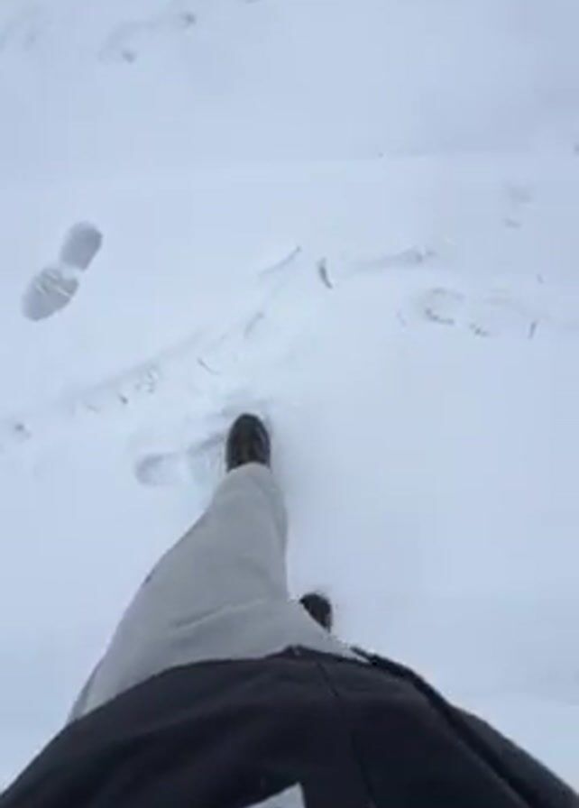 A person walks in the snow. The person is wearing light grey sweatpants, a black jacket and black shoes. Their feet and the jacket are visible. The camera is pointed downward so the person's face is not visible. The snowy ground shows footprints. After a few steps, the camera moves upward and shows a landscape covered in snow. There are rocks, bushes, trees and a car visible. The sky is grey. The wind is blowing.