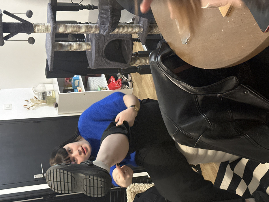 A person wearing a blue sweater and black pants, is seen wearing a black shoe. Next to the person is a small table. In the background is a cat tree and a white shelf with items. Additionally, a black and white patterned carpet can be seen.