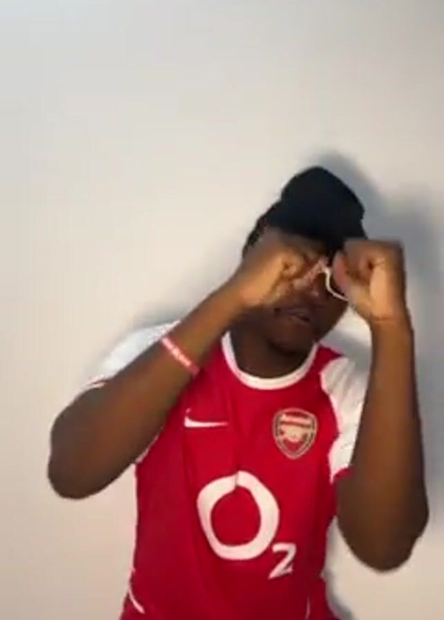 A dark-skinned person wearing an Arsenal soccer jersey, black beanie, white sunglasses, and jeans is dancing against a white wall