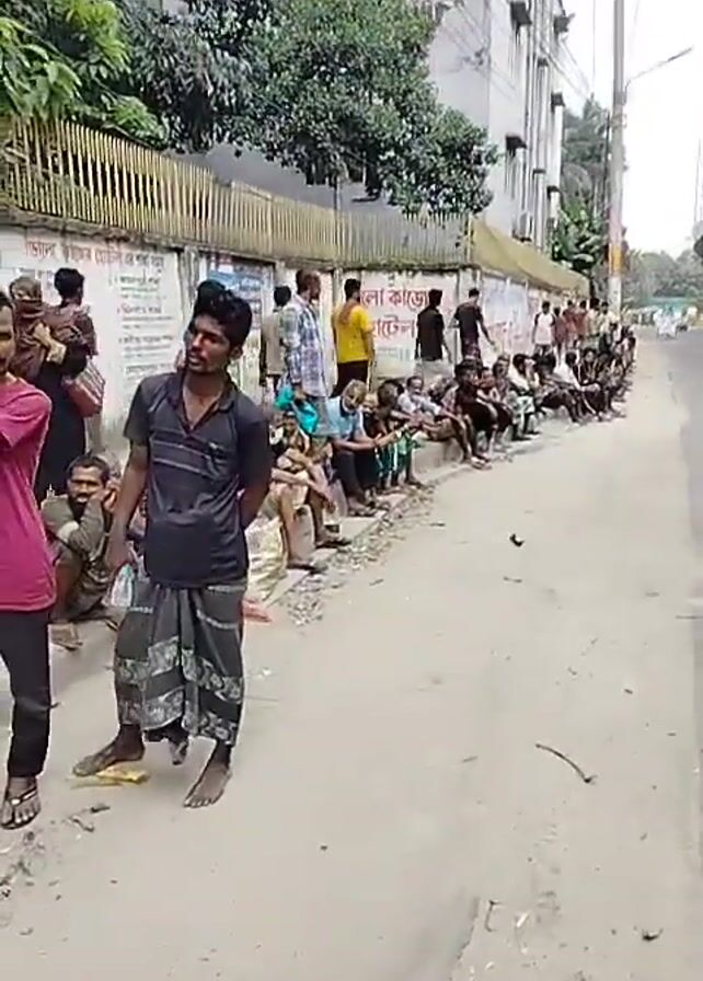 long line of men sitting and standing alongside a sidewalk in what appears to be a city. Most of the men are dressed casually, and some are barefoot or wearing sandals. Many of them are sitting on the curb, while others stand. The environment is urban, with buildings lining one side of the street and what appears to be an elevated roadway in the background. There is text written on the wall next to the sidewalk. The overall impression is one of people waiting or resting.