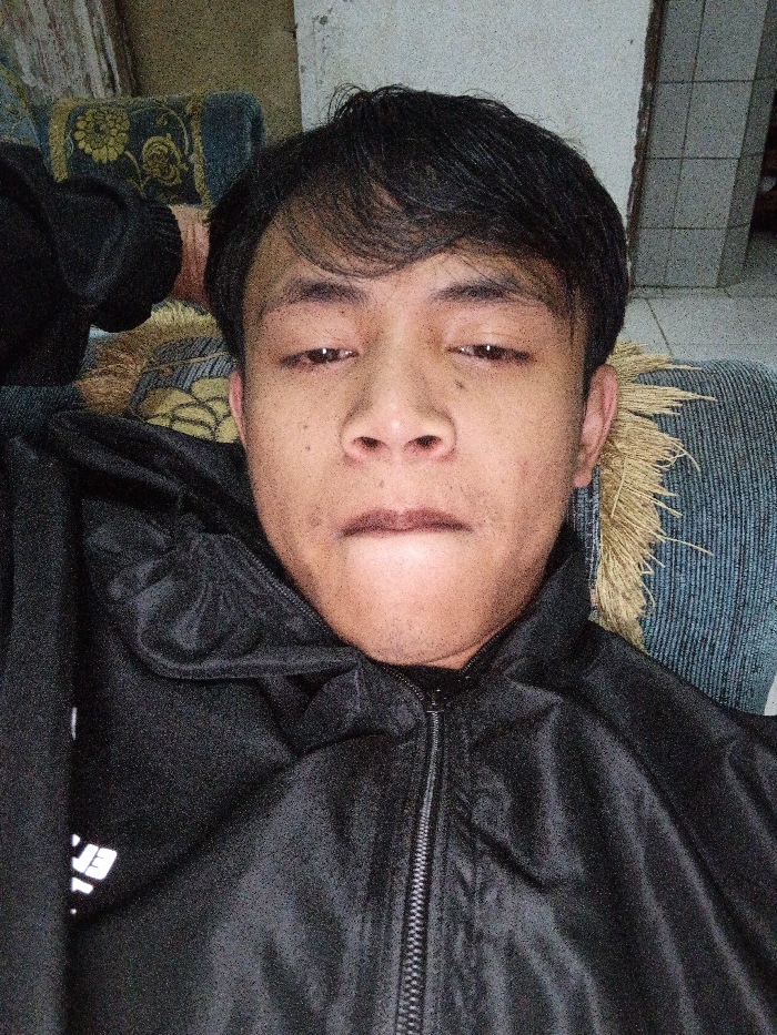 A close-up captures a dark-haired man lying on a patterned cushion, wearing a black jacket zipped up to his neck. His face, centrally framed, displays slightly tired eyes. Skin blemishes are visible. The background features a tiled wall and the edge of a sofa with a floral design. The overall lighting is dim, adding to the relaxed, intimate feel.