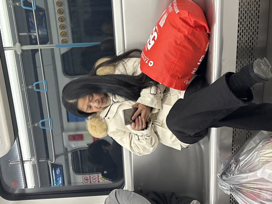 The scene depicts the interior of a subway train car in Shuangfu, China. An adult female with long, straight, dark hair is seated on a metallic bench, occupying the right side of the frame. She wears a light-toned, fur-hooded jacket over dark trousers and dark footwear. Both hands hold a silver-grey smartphone, at which she is looking down. To her immediate right, a large, rectangular red bag with white Chinese characters including "淘特" (Taote), "天猫" (Tmall), and "5G" is placed on the seat. A crumpled silver plastic bag is partially visible on the floor below the seat to the far left. The train's interior features linear overhead lighting, light blue plastic hand-grips suspended from a rail, and a window reflecting interior elements and indistinct exterior visuals. A partial view of another passenger in grey clothing is visible on the far left of the frame, adjacent to the primary subject.
