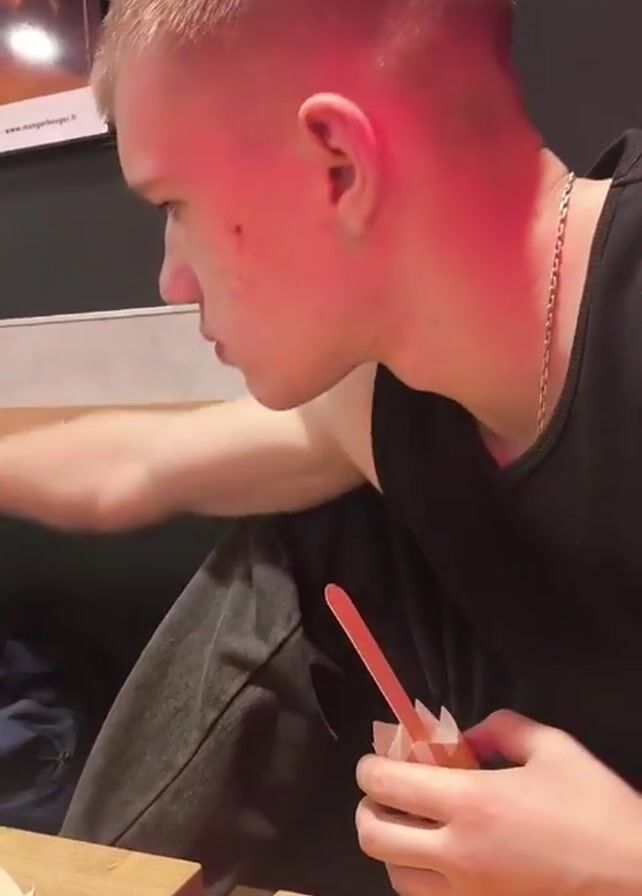 - "A young man with a buzz cut and a silver chain sits at a wooden table inside a restaurant with dark gray walls" by FM-NIq6z1, licensed under CC BY 4.0