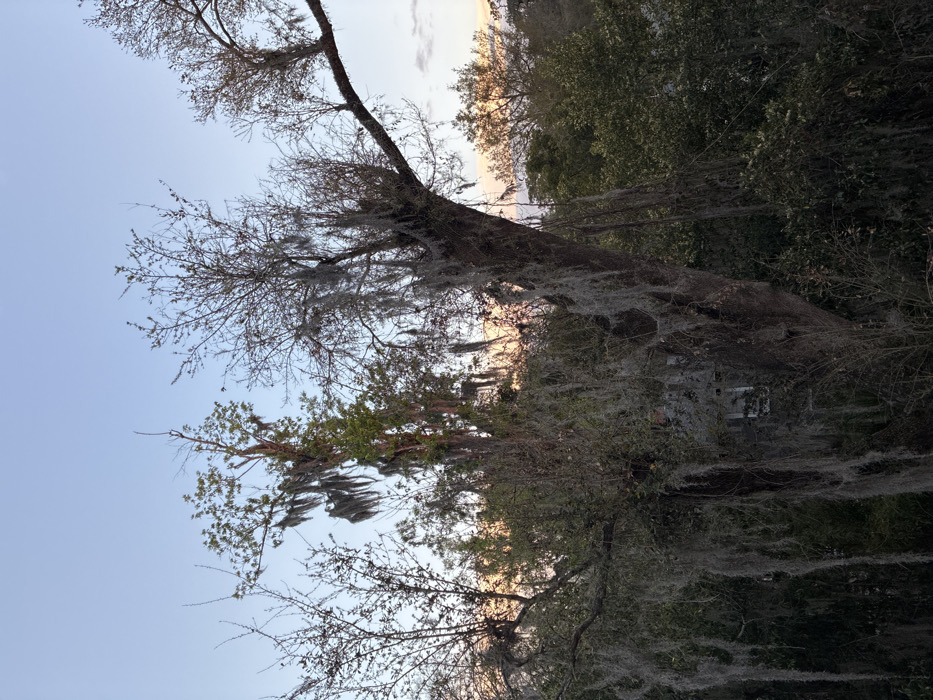 The image displays a natural landscape in Gainesville, United States of America, during twilight, characterized by a clear sky exhibiting a blue-to-pale orange gradient. The scene is dominated by dense, subtropical vegetation. Multiple mature trees, heavily adorned with copious greyish-green Spanish moss (Tillandsia usneoides), occupy the foreground and midground. The central tree features a thick trunk and sprawling branches, some with sparse foliage, others with denser green leaves. A dense understory of green foliage is present beneath and behind the primary tree line. In the lower-middle left, a light-colored, man-made structure, likely a residential building, is partially discernible through the foliage and moss, revealing a window and an exterior wall. No human figures are present, and no actions or interactions are observed.