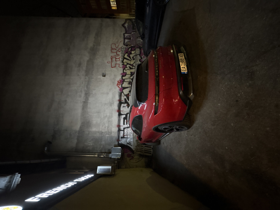 The image depicts a nighttime scene within an alleyway in Sofia, Bulgaria, adjacent to a "French Tacos" establishment. The primary subject is a red Porsche Taycan Cross Turismo electric vehicle, parked facing away from the viewer, positioned slightly to the right of the alley's center. Its rear license plate, "EA 2888 AB," is clearly visible. To the right and further back, a dark-colored vehicle is partially visible. The left side of the alley is defined by a building wall painted in a yellow-tan hue, featuring an illuminated white sign that reads "FRENCH TACOS." Below the sign, a wall-mounted air conditioning unit and a vertical metallic ventilation duct are present. The right side and background consist of a tall, unpainted concrete or stucco wall, the lower portion of which is covered with multi-colored graffiti tags in red, white, and black. A stack of light-colored wooden pallets is visible against the left wall, behind the red Porsche. The ground surface is dark, appears to be paved, and exhibits minor irregularities and debris. In the far background, a multi-story building is dimly lit, with yellow light emanating from at least one window. No individuals or active interactions are present in the scene.