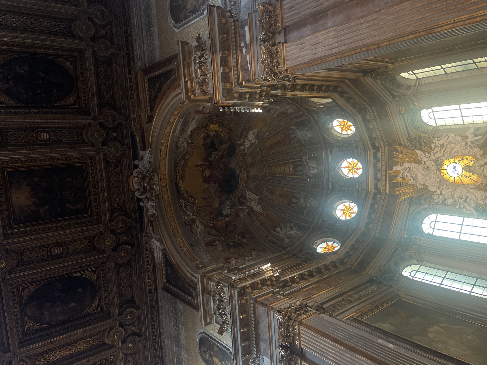 The image captures the ornate ceiling of a church in Naples, Italy. The ceiling is a complex arrangement of gilded and painted surfaces. An octagonal dome dominates the central part of the image. The dome features paintings and is surrounded by smaller circular windows with star-shaped designs. Windows are aligned along one side, allowing sunlight to illuminate the interior. The light creates a hazy effect, enhancing the details of the architectural features. The church's ceiling is adorned with intricate detailing. The composition emphasizes the grandeur and architectural skill of the Italian Renaissance period.