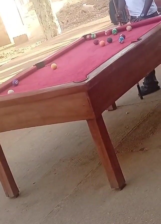 billiards table on an outdoor concrete surface. The table is wooden with a red felt playing surface. Several billiards balls are scattered on the table. A person in a white shirt stands near the table, holding a pool cue. Another person is partially visible behind them. A building and trees are visible in the background. The focus is on the billiard table and the immediate action of someone playing pool.