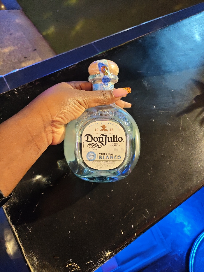 A hand with orange leopard print nails holds a bottle of Don Julio Blanco tequila. The bottle, which is mostly full, sits on a dark, textured surface. The tequila bottle has a clear body with blue tint, and a tan wooden top covered with blue patterned paper. The Don Julio logo is visible on the label. The background shows hints of a green and blue surface.