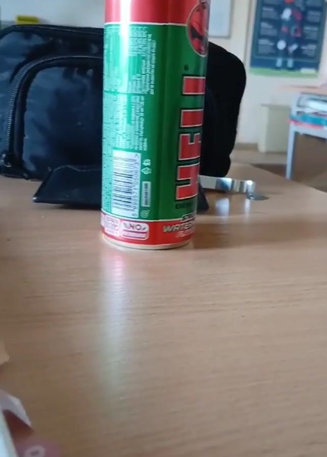 student's desk, likely in a classroom, during a lesson. The desk has a light wood-grain surface. Initially, a can of "Hell" energy drink stands upright on the desk, along with a black bag in the background. As the video progresses, a notebook is placed on the desk, followed by a textbook opened to several pages. A person's arm and sleeve are visible in the lower-left corner of the frame, and other students can be seen in the background, seated at desks. The overall impression is of a typical classroom setting with educational materials present.