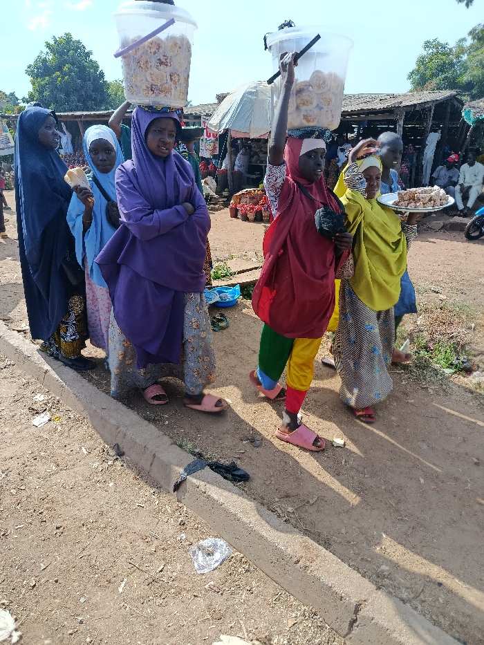 The image depicts an outdoor market scene in Jere North, Nigeria, under clear daylight. Five females are prominently featured in the foreground, standing or walking on a dirt path adjacent to a concrete curb. From left to right: a woman in a dark blue hijab and patterned attire holds a light-colored bread item; a girl in a light blue hijab and patterned dress carries a black shoulder bag and looks towards the camera; a woman in a purple hijab and patterned trousers balances a large, clear plastic bucket filled with circular baked goods on her head, her arms crossed; another woman in a red top, multi-colored (red, green, yellow, blue) trousers, and a black shoulder bag carries a similar clear plastic bucket of baked goods on her head, steadying it with her raised left hand; and a woman in a yellow hijab and patterned dress carries a white circular tray holding light-colored rectangular sweets at chest height. All individuals are wearing sandals or flip-flops. The foreground ground consists of packed dirt with scattered debris, including plastic and paper, near the concrete curb. In the midground and background, multiple rustic market stalls with wooden frames and simple roofs are visible, displaying various goods, including red produce. Several other individuals are present in the blurred background, some seated. A blue scooter is partially visible in the far background. Green foliage from trees is present in the upper left and right background.