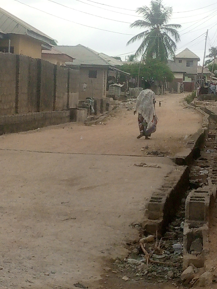A dirt road in Zango-ndaji, Nigeria, stretches into the distance under an overcast sky, flanked by numerous single-story and one two-story residential structures with corrugated metal roofs. Concrete block walls and exposed block foundations line the properties. A prominent palm tree rises in the mid-ground. An individual, wearing a patterned lower garment and a light-colored, possibly white, loose-fitting shawl covering their head and upper body, walks away from the viewer down the center of the unpaved road. They wear dark footwear. Ahead of this individual, a small, dark-colored animal, possibly a dog, walks further down the road. Open drainage ditches constructed from concrete blocks run along both sides of the road, containing debris including branches and discarded materials. Utility lines traverse the upper portion of the scene.