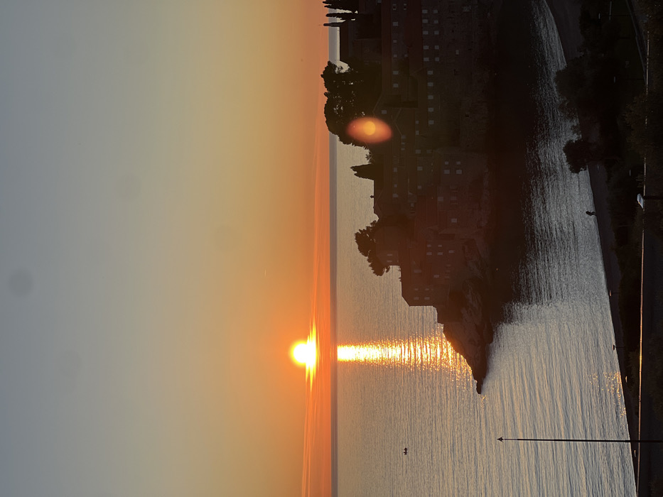 The image captures a coastal landscape featuring Sveti Stefan, Montenegro, during either sunrise or sunset. The sun, a bright orange orb, is centered in the mid-left portion of the frame, positioned above the horizon, and casts a prominent golden-orange reflection across the calm sea directly towards the foreground. The sky above is graded, transitioning from a light blue-grey at the top to vibrant orange and red tones near the horizon. Sveti Stefan, identifiable as a densely built-up island village, occupies the mid-right section of the image. It comprises numerous stone buildings with reddish-brown roofs, nestled on a rocky promontory. Various trees, including tall, slender cypresses and broader pine-like trees, are scattered across the island. A distinct orange-yellow lens flare is visible over the vegetation on the right side of the island. On the water, a small, dark boat containing two indistinct figures is positioned to the left of the sun's reflection. The immediate lower foreground reveals a dark, indistinct landmass, possibly a hillside or coastline, with sparse vegetation. A paved path or road runs along the water's edge below Sveti Stefan, on which a single small, silhouetted human figure is observed walking towards the right. A dark, vertical pole, possibly a utility or light post, extends upwards from the lower-left corner of the image, partially obscuring the foreground.