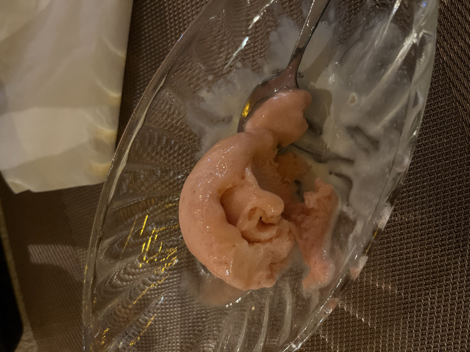 The image displays a close-up, elevated view of a partially consumed dessert within an indoor dining environment in the city of Baan Sri Thanu, Thailand. A clear, leaf-shaped glass bowl occupies the central frame, containing melted pink-colored ice cream or sorbet. A significant amount of the dessert has liquefied, forming a pool at the bottom of the bowl, while some solid, irregular portions remain, including one large scoop-like mass. A silver-colored spoon rests horizontally within the bowl, partially submerged in the melted liquid and leaning against the remaining solid dessert. The bowl is placed on a brown, tightly woven surface, likely a placemat. In the upper right background, a crumpled white napkin or cloth is visible. Reflections of ambient or artificial light sources are present on the surface of the glass bowl and the spoon. No individuals are depicted in the scene.
