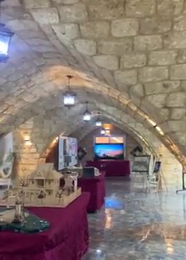 The camera pans around an art gallery with a distinctive arched stone ceiling. Lanterns are attached to the walls and ceiling. There are a few display tables covered in red tablecloths. On the tables are crafts and art pieces. Easels holding more art pieces are scattered around the room. There is a window at the back of the room displaying an image of a sunset. Religious music is playing in the background.