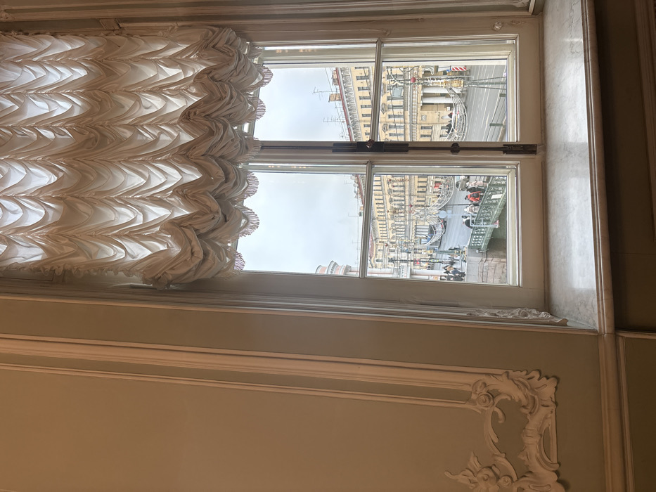The image displays a detailed view from an interior window of a grand building in Saint Petersburg, Russia