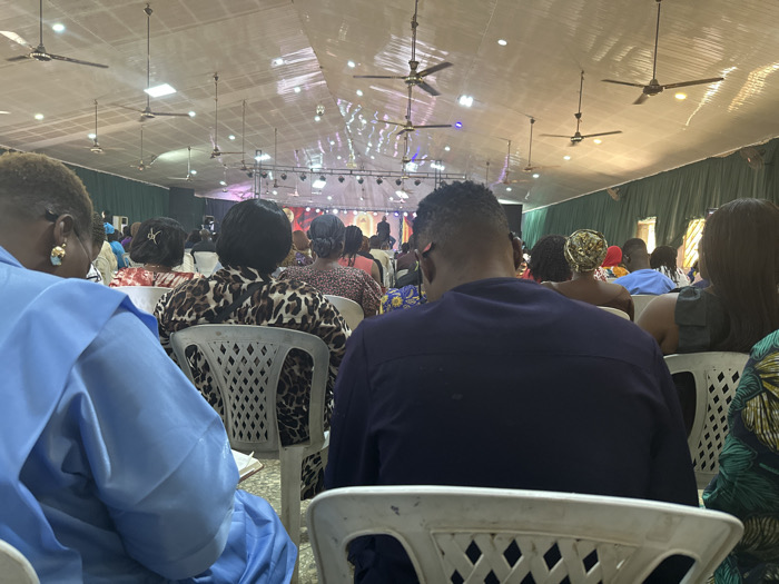 The scene depicts an indoor public gathering in a large hall located in Rido, Nigeria