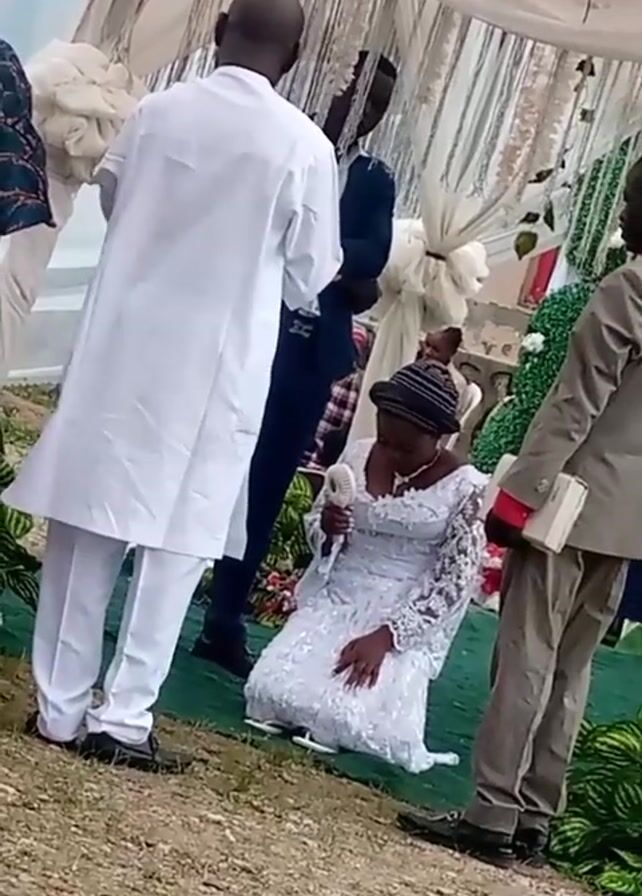 woman kneeling on the ground while holding a microphone and speaking. She is wearing a white dress with lace sleeves and a patterned head covering. Several people stand around her, including a man in a white robe, a man in a suit, and a woman in a patterned dress. The scene appears to be outdoors, possibly at a wedding or other formal event, with decorations and greenery visible in the background. The ground is covered in grass and some gravel.