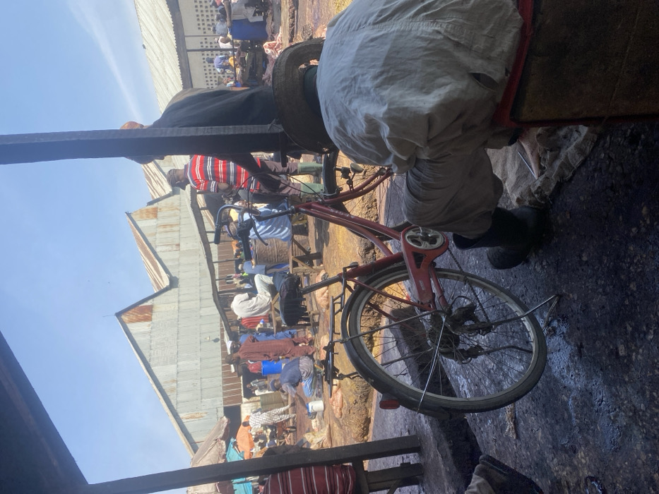 The image depicts an active outdoor market or industrial area identified as Kofar Mazugal, Nigeria, under a clear blue sky. In the immediate foreground, the back of a person wearing a light-colored, long-sleeved garment, dark rubber boots, and a straw hat is visible, seated on a red stool or low bench. To their left, a red single-speed bicycle is propped upright by a kickstand, its rear wheel and chain mechanism prominent. The ground in the foreground is dark, uneven, and appears damp or soiled. A dark, vertical metal beam of a structural support is visible on the right, partially obscuring the midground. The midground features numerous individuals, predominantly men, engaged in various activities. Piles of reddish-brown material, consistent with animal hides or skins, are scattered across the uneven, reddish-brown ground. Several metal barrels, some blue, and makeshift wooden benches or platforms are present. One man in a blue shirt is crouched near a white basin on the ground, seemingly cleaning or processing items. Another man, wearing a red and white striped shirt, stands behind the bicycle, facing away from the viewer. Other individuals are standing, sitting, or moving through the space. Many wear casual attire, including long shirts and trousers, with some wearing rubber boots. In the background, a series of large, industrial-style buildings with aged, corrugated metal roofs displaying a distinctive sawtooth profile are prominent. The roofs show areas of rust. Beyond these structures, additional market activity and people are discernible under the clear sky.