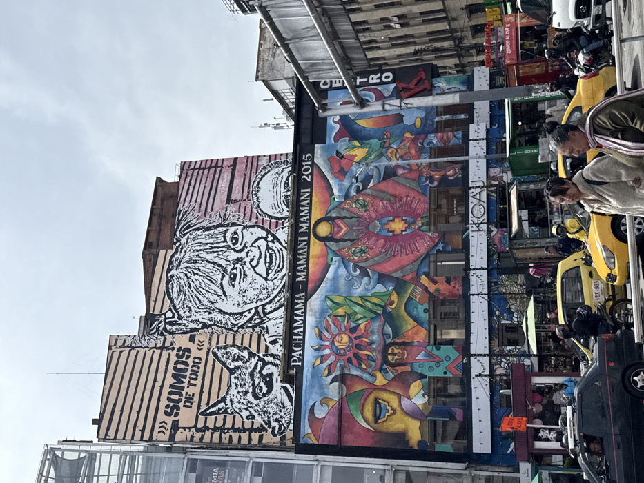 The image depicts a bustling street scene in the city of Bogota, Colombia, under an overcast sky. The focal point is a multi-story building featuring extensive murals. The uppermost mural, rendered in black and white stipple on a striped beige background, displays a grinning child with pigtails, a dog's head, and part of an adult's face. Text "SOMOS DE TODO" is visible on the left. Below this, a banner reads "PACHAMAMA - MAMANI MAMANI 2015". Beneath the banner, a large, vibrant, multi-colored mural covers several floors, incorporating abstract shapes, a stylized sun, vegetation, and a central robed figure with indigenous patterns. Windows are visible within this colorful mural. Below the mural, at street level, a sign for "KOAJ" is present. To the left, a modern building with a glass facade is partially visible. To the right, an older building features a vertical sign that reads "CENTRO". Multiple antennas are visible on distant rooftops. At street level, traffic moves from right to left. A dark-colored sedan with a roof rack is in the foreground, with a male driver visible. Two yellow taxis are present; one in the mid-ground displays license plate YEX-9B5. Motorcycles are also in traffic. In the foreground, two women walk from right to left; the lead woman wears a light-colored fleece jacket, and the woman behind her wears an olive-green jacket and a patterned scarf. Various street vendor stalls are set up along the sidewalk, including a green tent-like structure and colorful kiosk boxes, one labeled "CUMPLOS DE VIDA." Overhead wires traverse the street. A metal railing separates the viewer from the immediate street activity.
