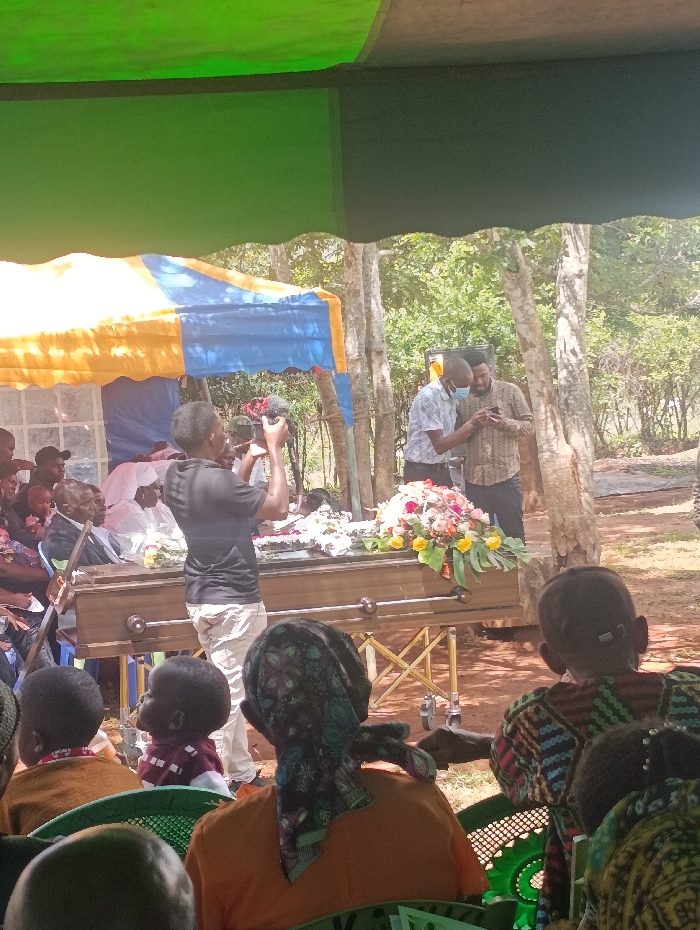 The image portrays an outdoor funeral or memorial service situated in Muthetheni ward, Kenya