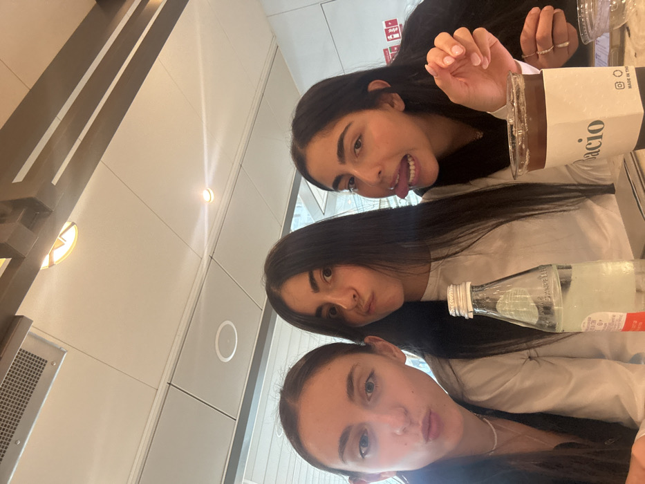 Three young adult females are depicted in a close-up, selfie-style photograph, seated indoors at what appears to be a cafe or restaurant