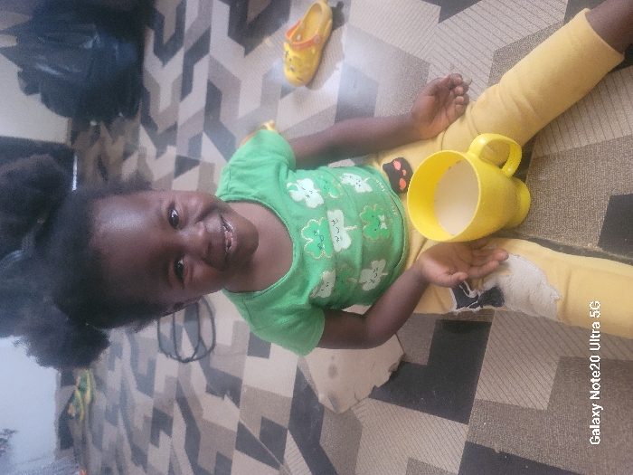 An indoor scene within Barakin Akawo, Nigeria, depicts a young Black child, likely a toddler, seated on a geometrically patterned tiled floor. The child is positioned centrally, facing the camera with a broad smile, revealing teeth. The child wears a light green, short-sleeved t-shirt adorned with white and green shamrock designs and cartoon characters, and yellow pants or leggings with distressed areas on the left leg. A bright yellow mug containing a light brown liquid is situated on the floor between the child's extended legs. The child's hands rest on the floor near the mug. In the background, to the left, a pair of yellow and green shoes are visible, while a single yellow sandal and several black plastic bags are present to the right. A partially visible metallic object is in the left background. A piece of light-colored cardboard or paper is beneath the child's left leg. The image includes a "Galaxy Note20 Ultra 5G" watermark in the lower-left corner.