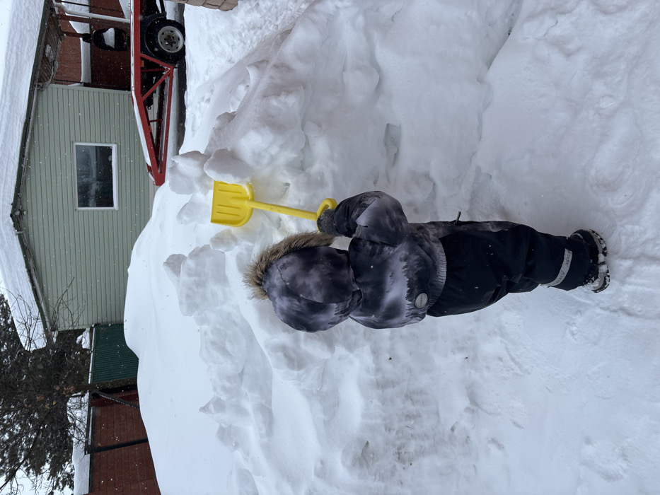 - "A child in a snowsuit stands in deep snow, holding a yellow plastic shovel" by FM-qgTxo2, licensed under CC BY 4.0