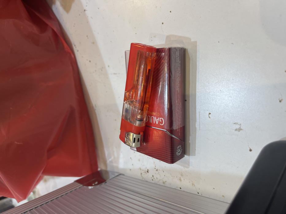 The scene, located in Babella, Syria, depicts a static arrangement of objects on a light-colored, granular surface. Centrally, a red rectangular package of "GAULOISES COMPACT" cigarettes, appearing new and sealed in plastic, rests horizontally. A partial warning label is visible on the package. Superimposed horizontally on the cigarette pack is a transparent red disposable lighter, which contains a visible orange-red fuel and features a metallic igniter. To the left, a portion of a silver-colored, vertically corrugated metallic object is visible. In the upper background, a large, crumpled red object, consistent with a plastic bag or fabric, occupies the frame. No individuals are present, and no actions or interactions are depicted.
