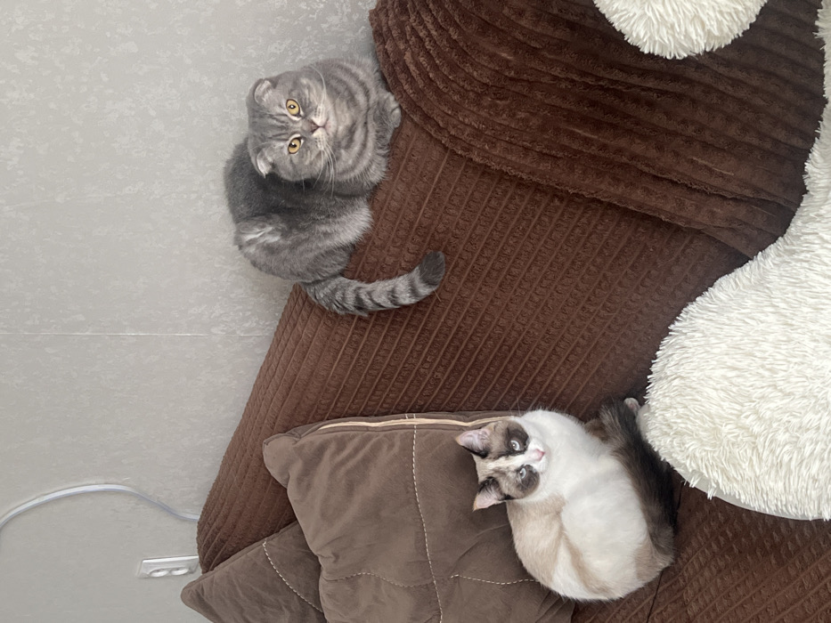 A high-angle shot reveals two cats on a brown corduroy couch. One is a gray, tabby Scottish Fold positioned near the top left, looking up. The other cat, a Siamese mix with white and tan fur, sits on a brown pillow at the bottom, also looking up. A large, white, fluffy object rests on the right side of the couch. The background includes a light gray floor.