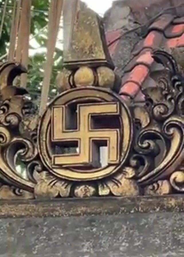 n ornate building facade in what appears to be a temple complex, possibly in Southeast Asia. The building is heavily decorated with carved stonework, including floral and geometric motifs. A prominent swastika symbol, executed in gold against a dark background, is visible near the top of one of the structures. The sky is overcast. There are no people visible in the frame. The camera slowly pulls back, revealing more of the complex, including an intricately carved door with a demonic figure above it. There are notices posted near the entrance.