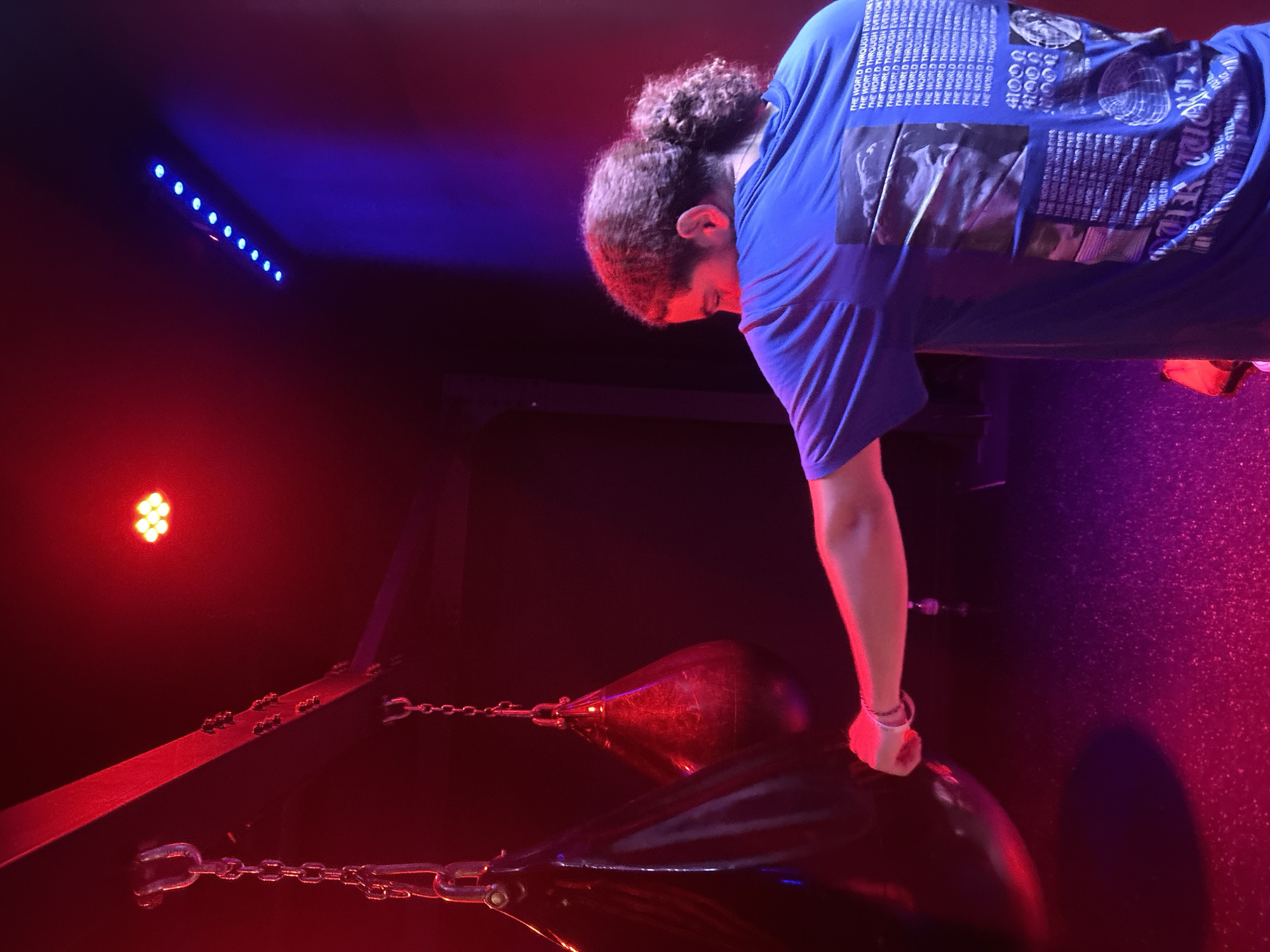 A person in a blue graphic t-shirt is pressing their weight down on a large, black punching bag, in a room with predominantly red and blue lighting. The individual has curly brown hair pulled back in a bun. The punching bag is suspended from a black metal frame via chains. Another, smaller punching bag is visible behind the larger one. The red and blue lights cast shadows on the surroundings, illuminating the ceiling. This scene is not in the city of Strasbourg, France.