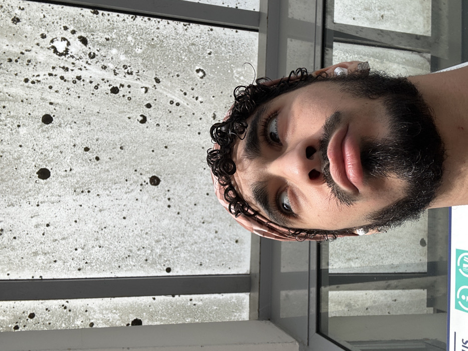 A young adult male, shown from the chest up, is depicted looking upwards and slightly to his left with a pouting expression. He has dark, curly hair, a full dark beard, and a mustache. He wears a light brown or pink patterned bandana covering his forehead. Both earlobes feature earrings: a white, pearl-like stud in each, with an additional square, possibly gem-studded earring below the right ear's stud, and a dangling white beaded earring below the left ear's stud. The background consists of a dirty, translucent overhead structure, likely glass or plastic, showing numerous dark spots and streaks. Below this overhead structure, vertical and horizontal structural beams are visible. In the lower left corner, a partial blue and white sign with green pictograms and partially visible text (likely "BUS") suggests a public transport shelter, such as a bus stop, in Orsay, France. The scene is illuminated by bright, overhead light.