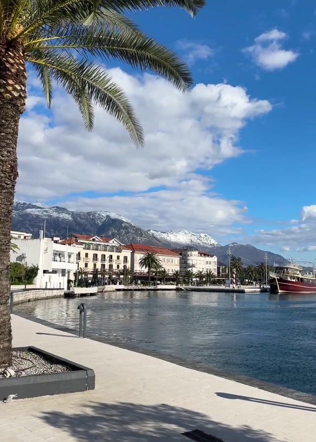 coastal scene with a bright blue sky speckled with white clouds. A row of palm trees lines a paved walkway, with snow-capped mountains visible in the background. Buildings with white facades and red-tiled roofs are situated along the waterfront. A red ship is docked in the water, and there are a few people sitting on benches along the walkway. The overall atmosphere is sunny and peaceful.