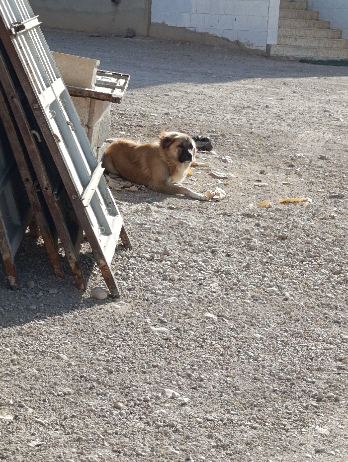 - "This image depicts a medium-sized, light brown and tan dog with darker fur around its muzzle and ears, lying prone on a gravelly, light-colored ground in the city of Al-Qutaifa, Syria" by FM-QMs472, licensed under CC BY 4.0